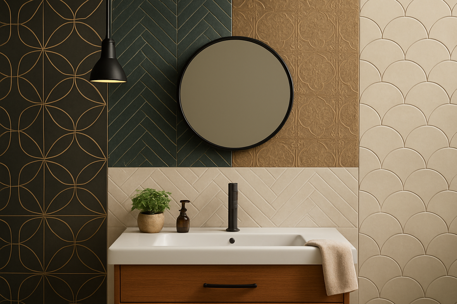 Los estampados siguen siendo fundamentales para crear interés visual en los baños. Los estampados clásicos como el diseño en espiga, el damero y los hexágonos siguen vigentes con nuevas interpretaciones. Los azulejos hexagonales crean efectos de panal que aportan geometría orgánica, mientras que las composiciones de formas mixtas que combinan cuadrados con rombos o rectángulos con curvas crean composiciones personalizadas con un aire artesanal.